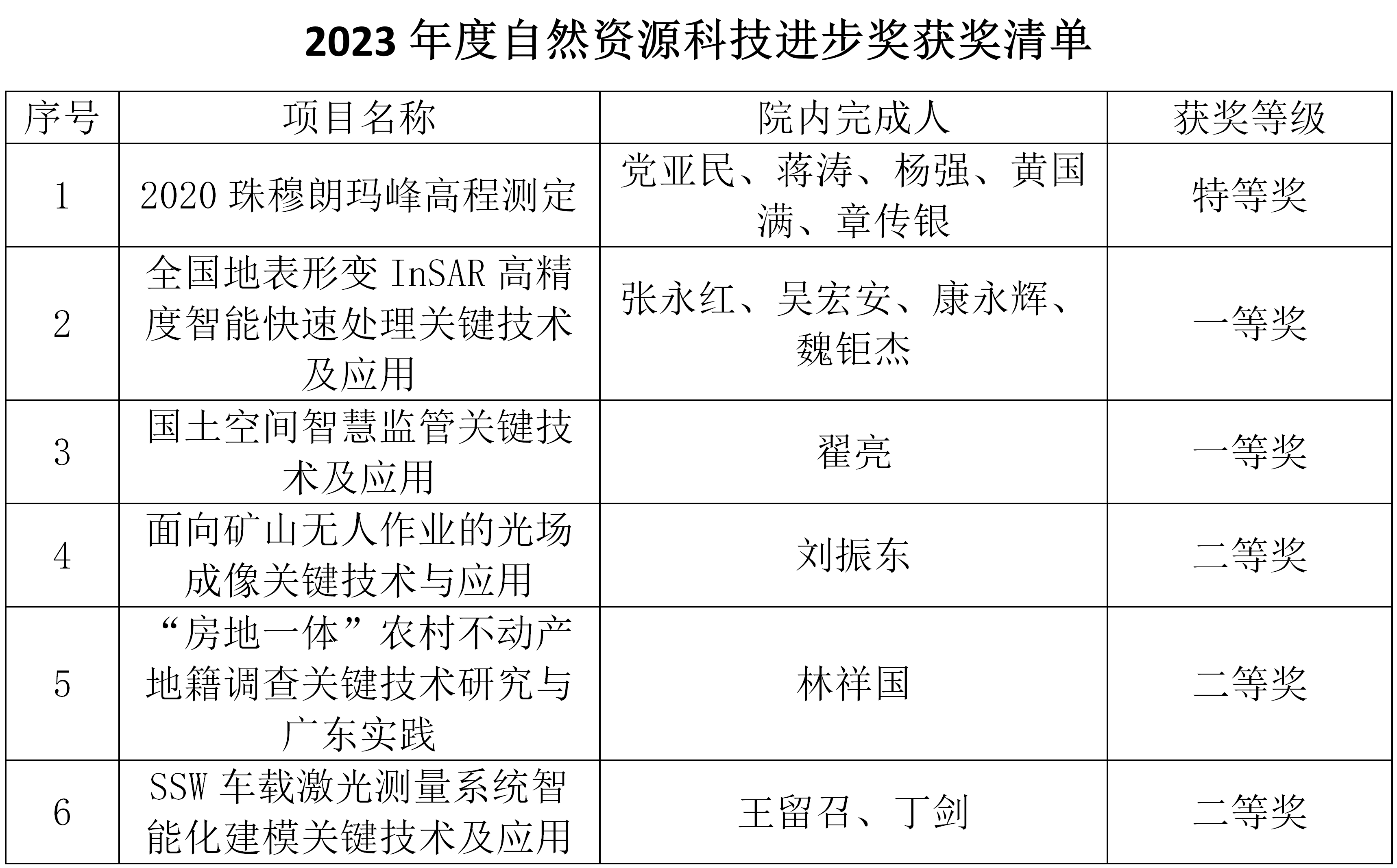 自然资源科学技术奖由中国测绘学会等8家学会和单位联合设立,旨在奖励自然资源领域取得重大理论、技术、方法创新,获得广泛应用且具有显著经济社会效益的成果,2023年度共评选自然资源科技进步奖125项,其中特等奖3项,一等奖24项。