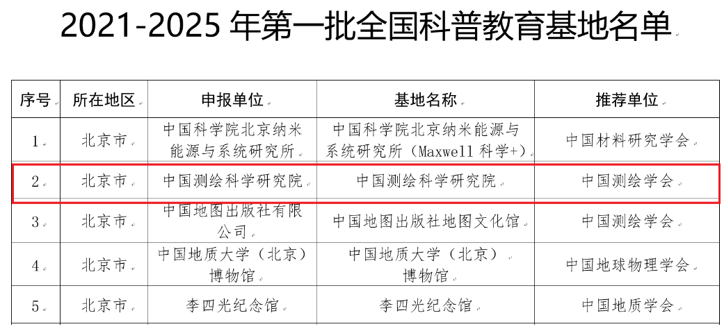 近日,中国科学技术协会发布了《中国科协关于命名2021-2025年第一批全国科普教育基地的决定》,中国测绘科学研究院成功入选2021-2025年第一批全国科普教育基地。