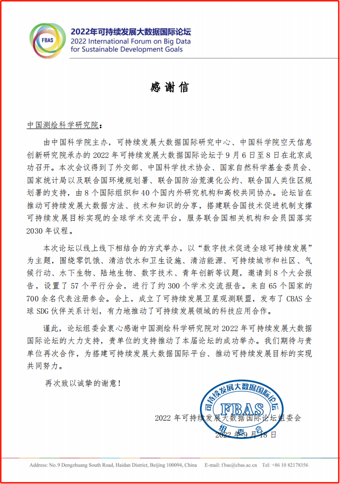 近日,2022年可持续发展大数据国际论坛组委会致函中国测绘科学研究院,感谢测科院对2022年可持续发展大数据国际论坛的大力支持,推动了论坛的成功举办。